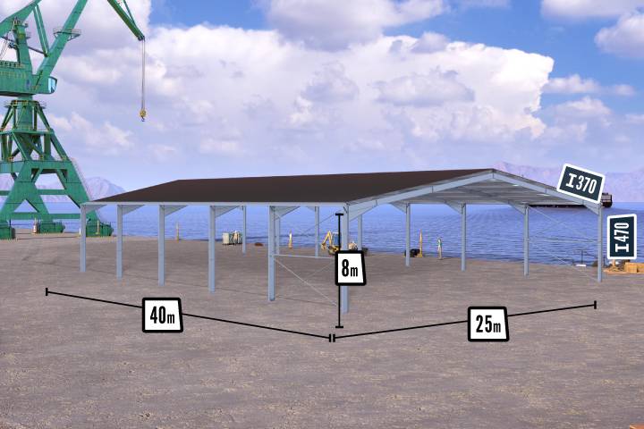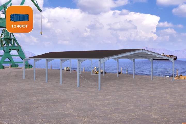 Develop your activity and your storage capacity thanks to our 1000m² building in kit shape, designed in spans of 8m to provide you with huge passages on the long sides. Made of PRS high resistance steel, our open kit building is ideal for multipurpose industrial activities such as factories, production lines, stores, offices showrooms, etc. Designed for easy assembly our 1000m² kit building requires only one 40' open-top container.
